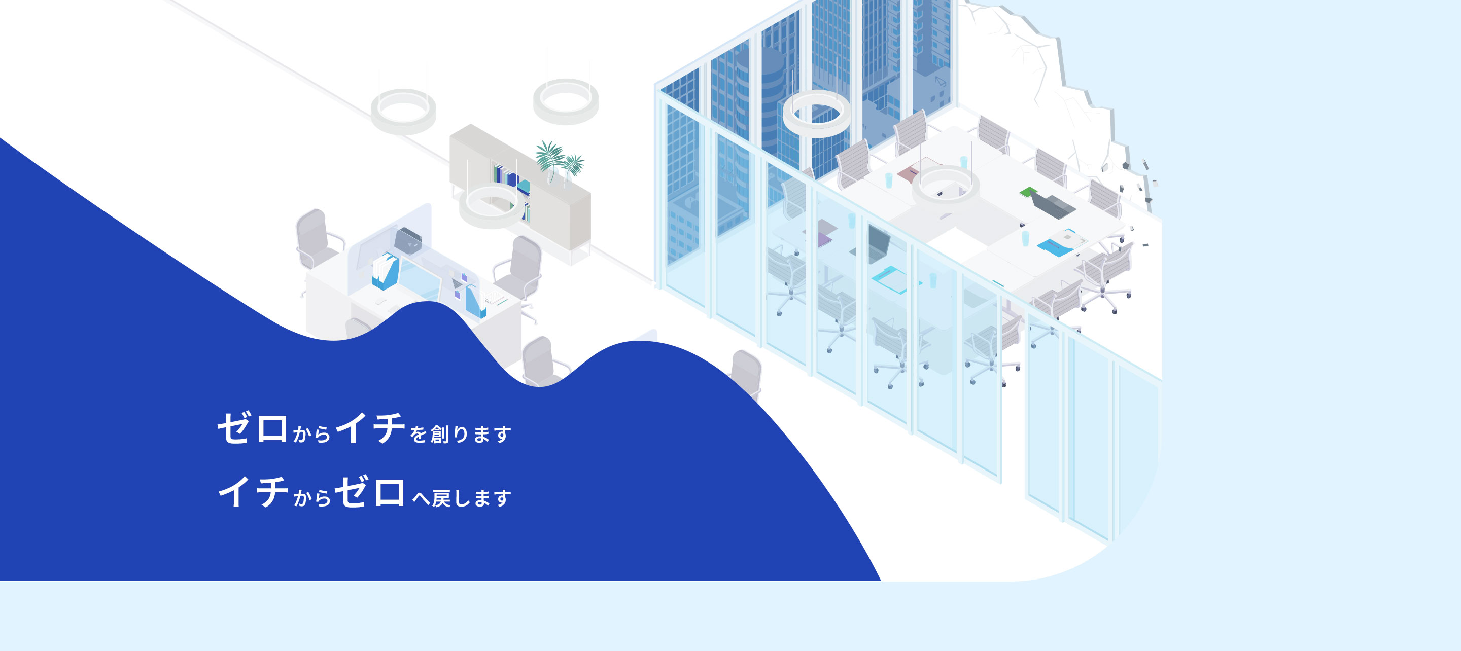 創業から内装に特化した原状回復工事・解体工事、作るときも壊すときも発生する産業廃棄物の適正処理とリサイクル事業、そして内装の企画、設計、製作、施工といった空間創造の分野も網羅してワンストップで高品質なサービスを提供しています。