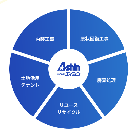 創業から内装に特化した原状回復工事・解体工事、作るときも壊すときも発生する産業廃棄物の適正処理とリサイクル事業、そして内装の企画、設計、製作、施工といった空間創造の分野も網羅してワンストップで高品質なサービスを提供しています。