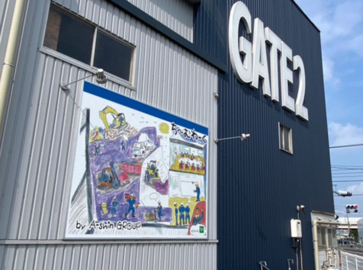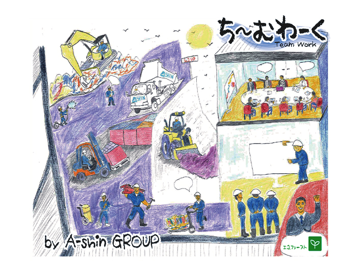 弊社の社員が描いたイラストで、「誠実さ」と「新しい価値の創造」を基本に、社員全員が力を合わせて仕事に取り組む姿勢を表現しています。