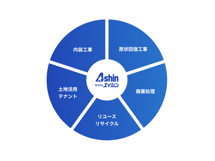 わたしたちエイシンでは、解体・内装・原状回復工事から産業廃棄物の収集運搬・中間処理まで、