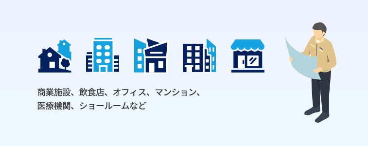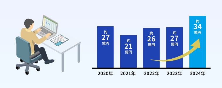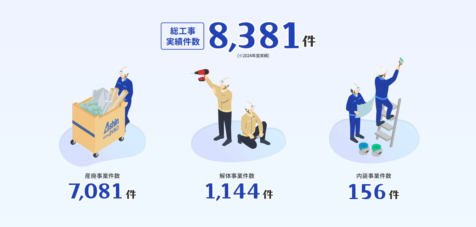 年間売上の推移、対応物件、事業別実績件数を掲載しています。